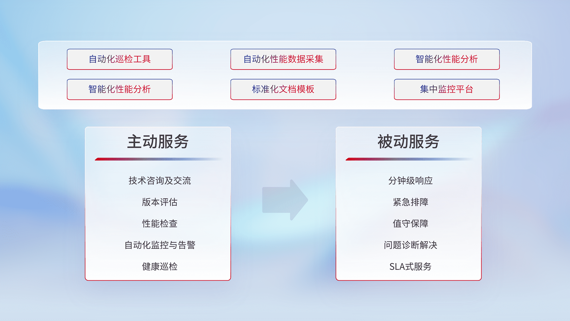 智能化工具和标准化文档,,,保障服务质量,,,提供主动服务(包含技术咨询、、、、版本评估、、性能检查、、、、自动化监控与告警、、、健康巡检)和被动服务包含(分钟级响应、、、、紧急排障、、、、值守保障、、、、问题诊断解决、、、、SLA服务)。。。